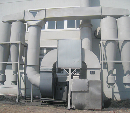在风机的作用下,含尘气体经管路进入高效旋风除尘设备,通过高效旋风除尘设备的高效流线分离作用,将粉尘分离落入下部灰斗,净化后的空气经风机进入净气管路,排入大气。