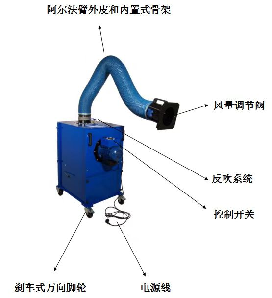 移动式焊接烟尘净化器是一种广泛适用在工业焊接、抛光、切割、打磨工序中进行焊接烟尘处理的可移动式环保设备。它一般配有2-3米长的柔性吸气臂,可以灵活固定在污染源附近净化对人体有害的粉尘,保护工作人员的健康。净化器的反吹系统能有效清除吸气臂的堵塞物,提高净化效率。风量调节阀能准确调节风量,减少噪声,节省能源。