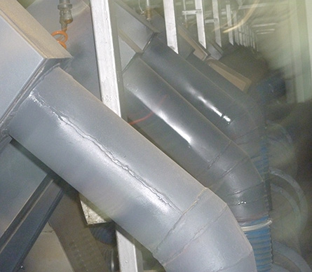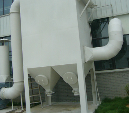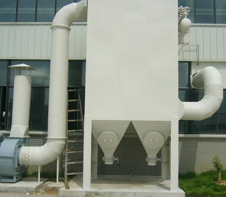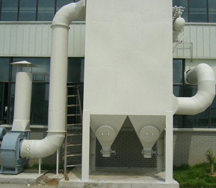 含尘的气体在风机负压的作用下,从滤袋除尘器的入口进入除尘室,通过滤袋的过滤作用,粉尘从气流中分离出来,被净化了的干净气体穿过滤袋进入净气室,经风机排空。粉尘经过滤袋过滤被留在滤袋的外表面形成粉饼层,当过滤粉尘达到一定厚度或经过一定的时间后,滤袋除尘器的运行阻力加大。为了使运行阻力控制在限定的范围内(一般为1200~1500Pa),脉冲喷吹控制仪定时发出信号,按顺序逐个触发开启脉冲阀,使分气箱的压缩空气由喷吹管喷射到各个滤袋,造成滤袋瞬间急剧膨胀。由于气流的作用,使积附在滤袋上的粉尘脱落。脉冲阀关闭后,再次产生反向气流,使滤袋急速回缩,形成一胀一缩,滤袋涨缩抖动,使积附在滤袋外表面的粉饼因惯性作用而脱落,滤袋得到更新。被清除掉的粉尘在重力作用下落入除尘器下部的集灰斗中。